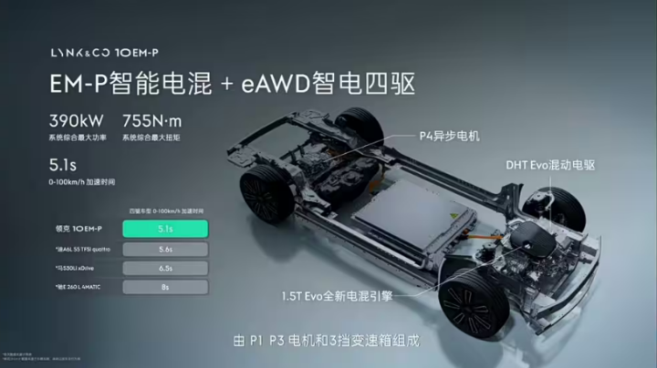 动力方面就是重头戏了,采用P1+P3+P4的电机,搭配1.5T+3档变速箱组成的EM-P混动,以下是各功率参数: